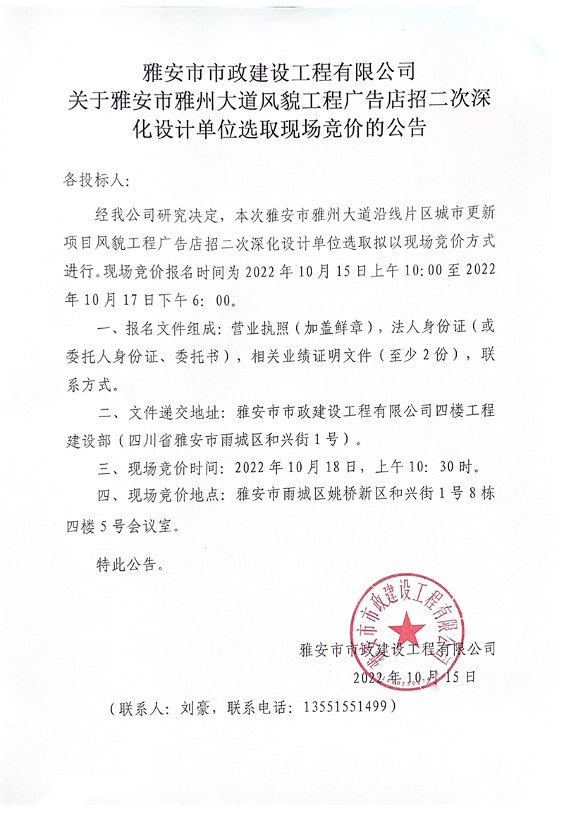 關(guān)于雅安市雅州大道風(fēng)貌工程廣告店招二次深化設(shè)計單位選取現(xiàn)場競價的公告