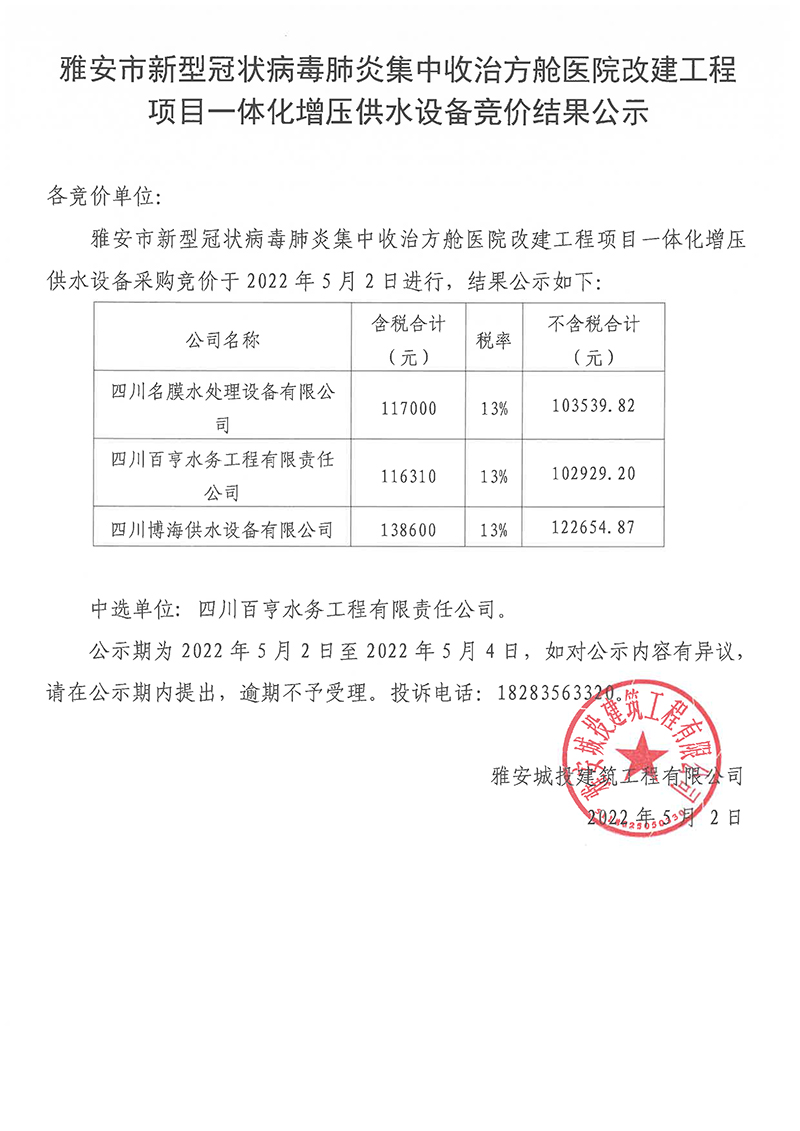 雅安市新型冠狀病毒肺炎集中收治方艙醫(yī)院改建工程項(xiàng)目一體化增壓供水設(shè)備競價結(jié)果公示