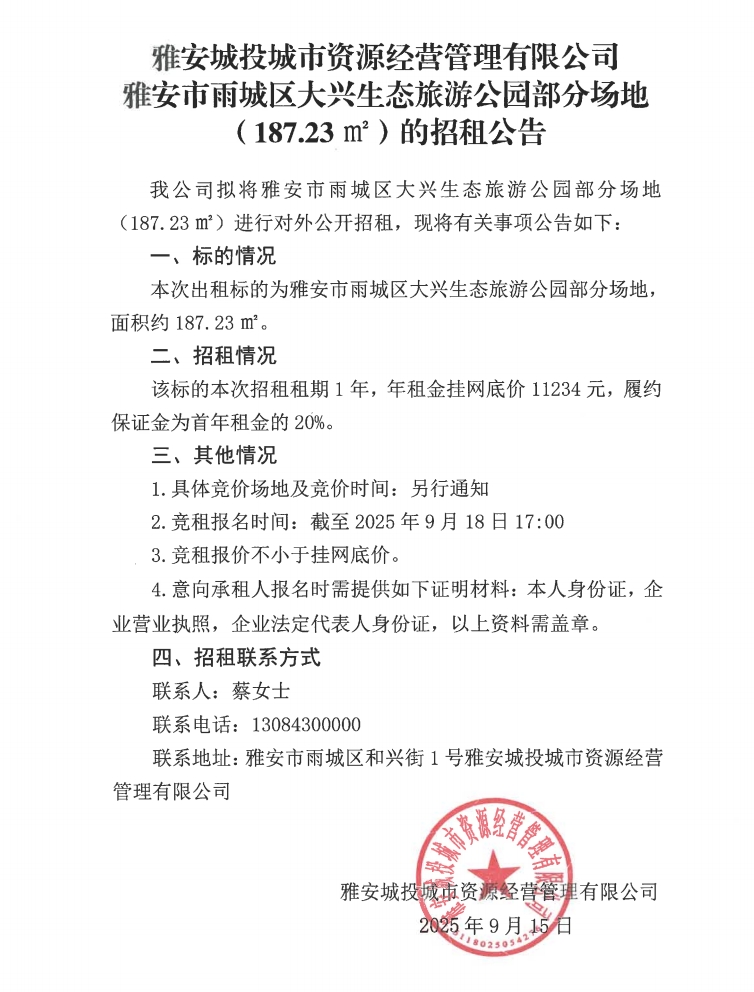 雅安城投城市資源經(jīng)營管理有限公司雅安市雨城區(qū)大興生態(tài)旅游公園部分場地(187.23㎡)的招租公告